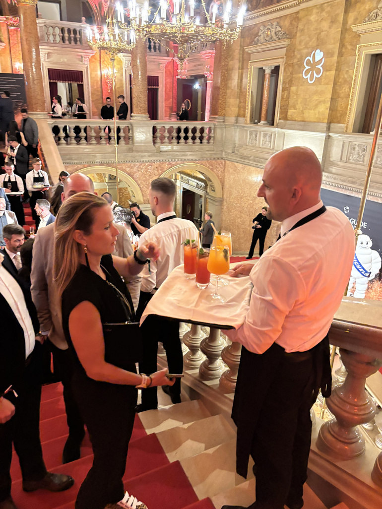 18:20 Az érkező vendégeket koktélokkal köszöntik, a hangulat egyelőre visszafogott.