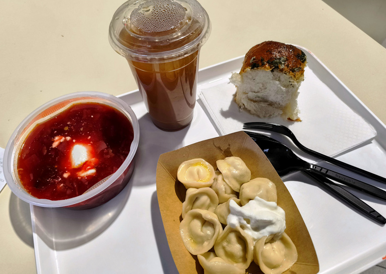 Bőséges, tejfölös borscs, frissen gőzölgő pelmenyi, kellemesen fokhagymás-kapros pampuska, egy gyros tál ára alatt Budán? Simán!