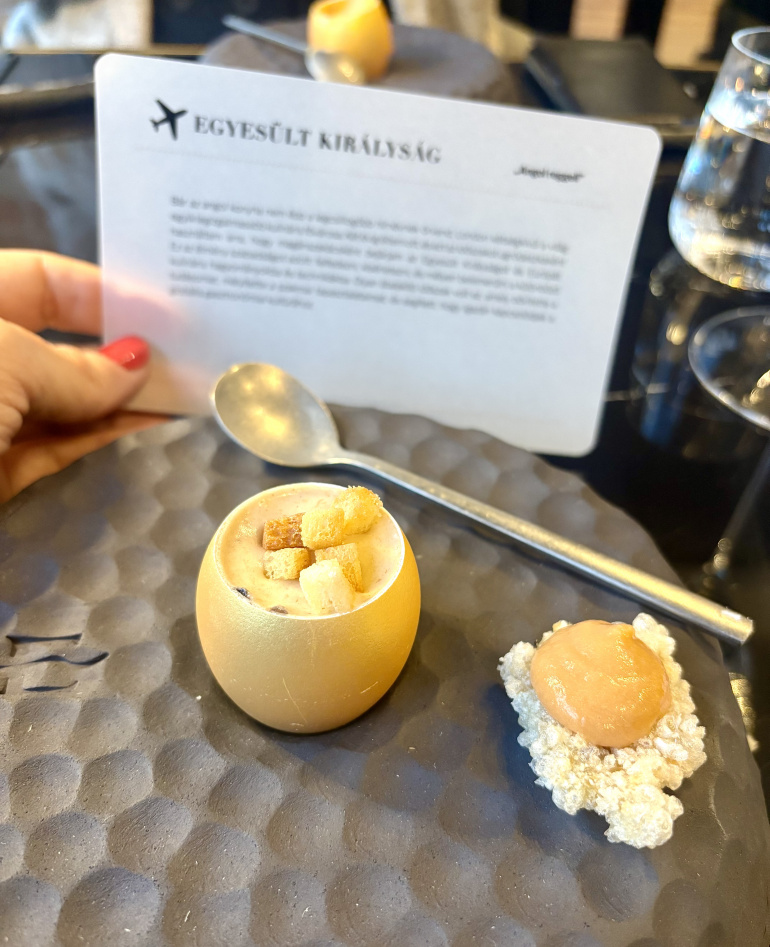 Franciaország a briós, a libamáj és a citromhéjas vaj, Belgium pedig a lassú tűzön főtt vörös márna, a Leffe sörös gofri, kagylóemulzió formájában képviselteti magát. Végül pedig megérkezünk Magyarországra, ahol igazán szaftos mangalicapofa és hagymás-mákos derelye a menü, némi hagymahabbal és pecsenyeszósszal.
