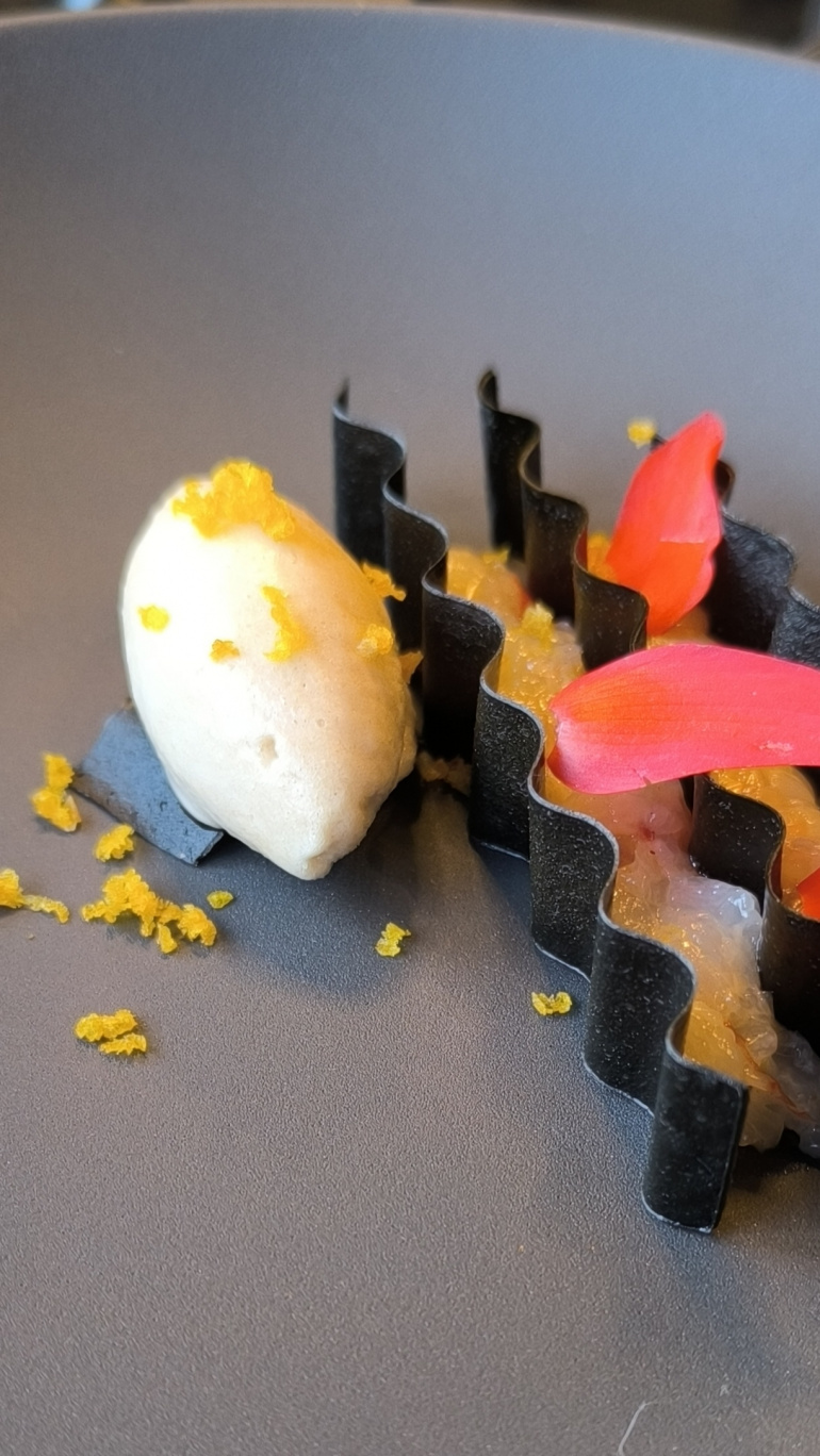 Az egyik leginkább eltalált fogás a Spanyolországot idéző garnélatatár, amely fekete fokhagymás ropogóssal (tuille) és sherry ecetből készült sorbet-val kerül a tányérra. Utóbbi egyébként, totálisan uralja a fogás ízét, mégis hagyja érvényesülni a többieket.