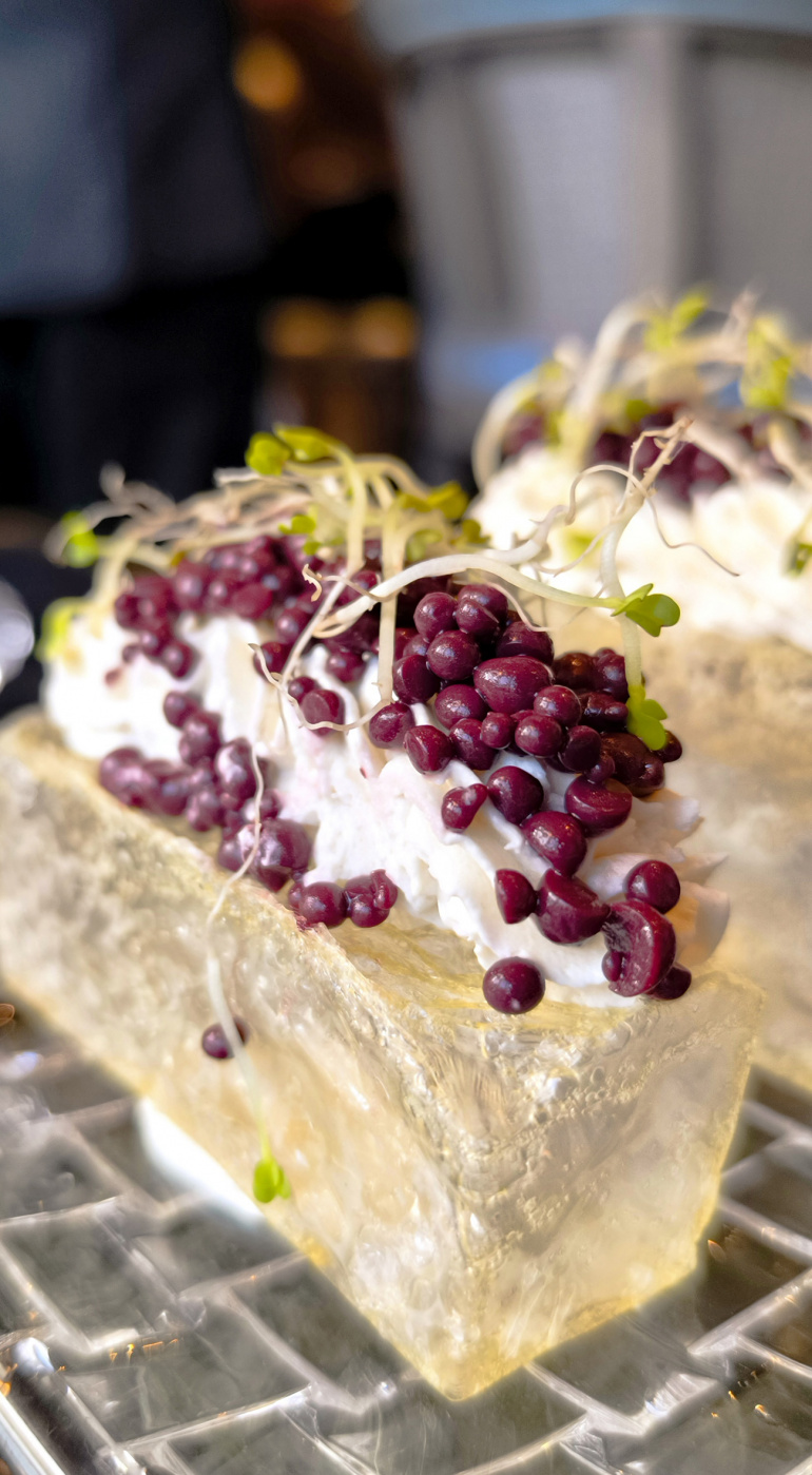 Brazíliát a Caipirinha pillecukor, jamgyökérhab és açai-kaviár képviseli, mindez roppanós kristálykenyéren tálalva. A szín és ízkavalkád vezető vonulata a panna cotta yuzus, kesudiós és citrusos szósza és a korianderolajjal. Könnyed étel, amely egyébként simán működne desszertként is.