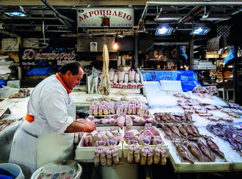 A leginkább autentikus, helyi fogásokért persze itt is a piaccsarnokot kell keresnünk. A Varvakios központi piac hentesei legalább akkora show-t produkálnak a félautónyi szarvasmarhák darabolása közben, mint olasz kollégáik. Tehénfejek, birkák, pacalok és konyhakész nyulak teszik ezt a részt még a szomszéd csarnok friss tengeri fogását kínáló standjainál is sokkal izgalmasabbá.