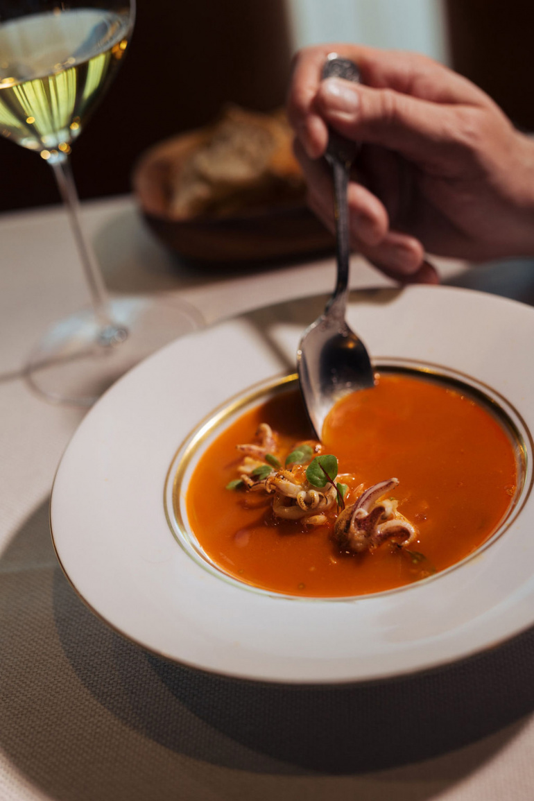 Az egyik legmerészebb fogás a magyar halászlé újraértelmezése. García számára a halászlé – a maga édesvízi karakterével és erős tradíciójával – teljesen új terep volt. Kanász László így mesél a kialakításáról: „A klasszikus halászlé olyan fogás, amelyről Spanyolországban nem hallottak, hiszen a földrajzi adottságaik miatt ott ritkán foglalkoznak édesvízi halakkal. Itt viszont éppen az volt az izgalom, hogy más tradíciók találkoznak. Mi nem paszírozott alaplevet használunk, és belehoztuk a korhely jelleg savanyúságát: a savanyított káposztát elősütjük, mellé blansírozott sárgarépát adunk. Ettől lesz a fogás könnyebb, játékosabb. A spanyol kapcsolódást a pirított tintahal és egy kevés csípős paprika adja, ami meglepően jól áll a magyar ízprofilnak. Szerintünk így sokkal népszerűbb, fogyaszthatóbb is lesz egy amúgy megosztó fogás”
