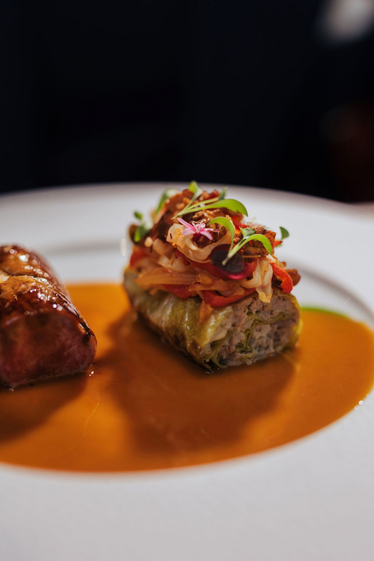 Mangalica „töltött káposzta” – gerslivel, mangalica-szalonnával és káposztajus-szal