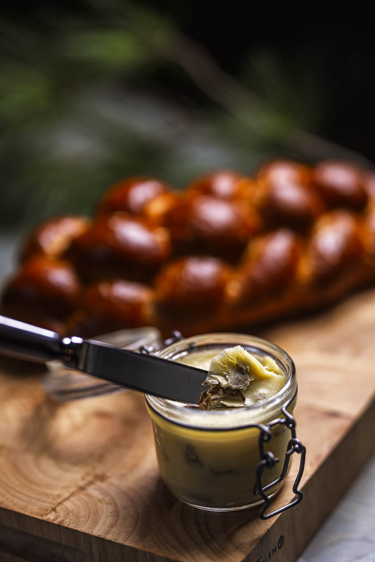 Foszlós, illatos kalács, krémes kacsamájjal. A kalácsot szeleteljük fel, aztán enyhén pirítsuk meg, majd a hűtőből már előre kivett, enyhén felmelegedett kacsamájat rákenjük és a lilahagymalekvárral együtt fogyaszthatjuk.