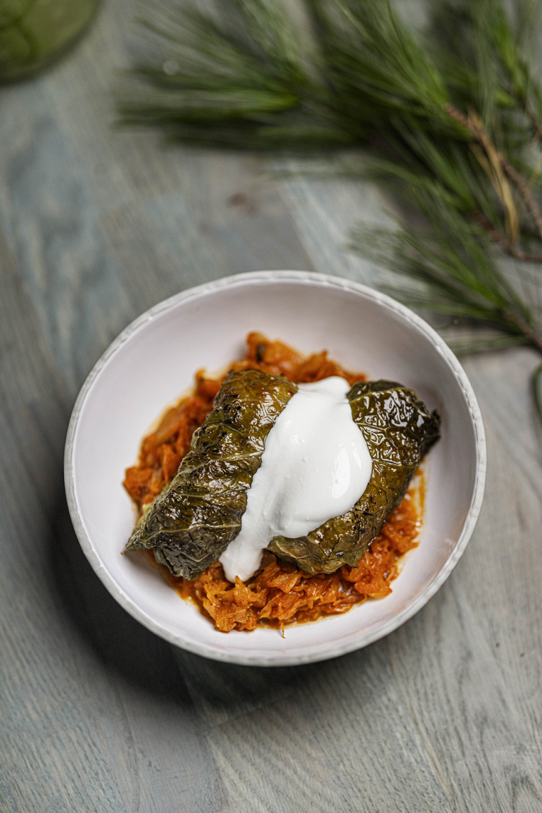 A vákuumzacskóban készen érkező töltött káposztát csupán ki kell bontanunk, tűzálló edényben, lassan összemelegíteni a sütőben, letakarva, kb. 130 C-on, 40 perc alatt. Tálaláskor pedig jöhet a tetejére a tejföl!