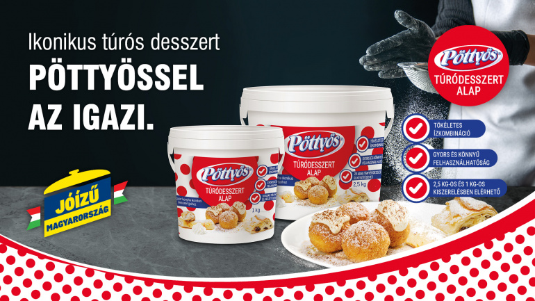 A Pöttyös Túró Rudi klasszikus íze jelenik meg és él tovább a márka új termékében, a Pöttyös Túródesszert Alapban is. A szállodák, éttermek és kávézók számára fejlesztett, professzionális desszertalap könnyed állaga és finom íze minden túrós fogást igazi Pöttyös-élménnyé varázsol. A 2,5 kg-os és 1 kg-os kiszerelésben is elérhető újdonság garantáltan hozza az autentikus Pöttyös minőséget, bármilyen édesség gyorsan elkészíthető vele, használata jelentős időmegtakarítást jelent a professzionális konyhák számára éppúgy, mint a hobbiszakácsoknak.